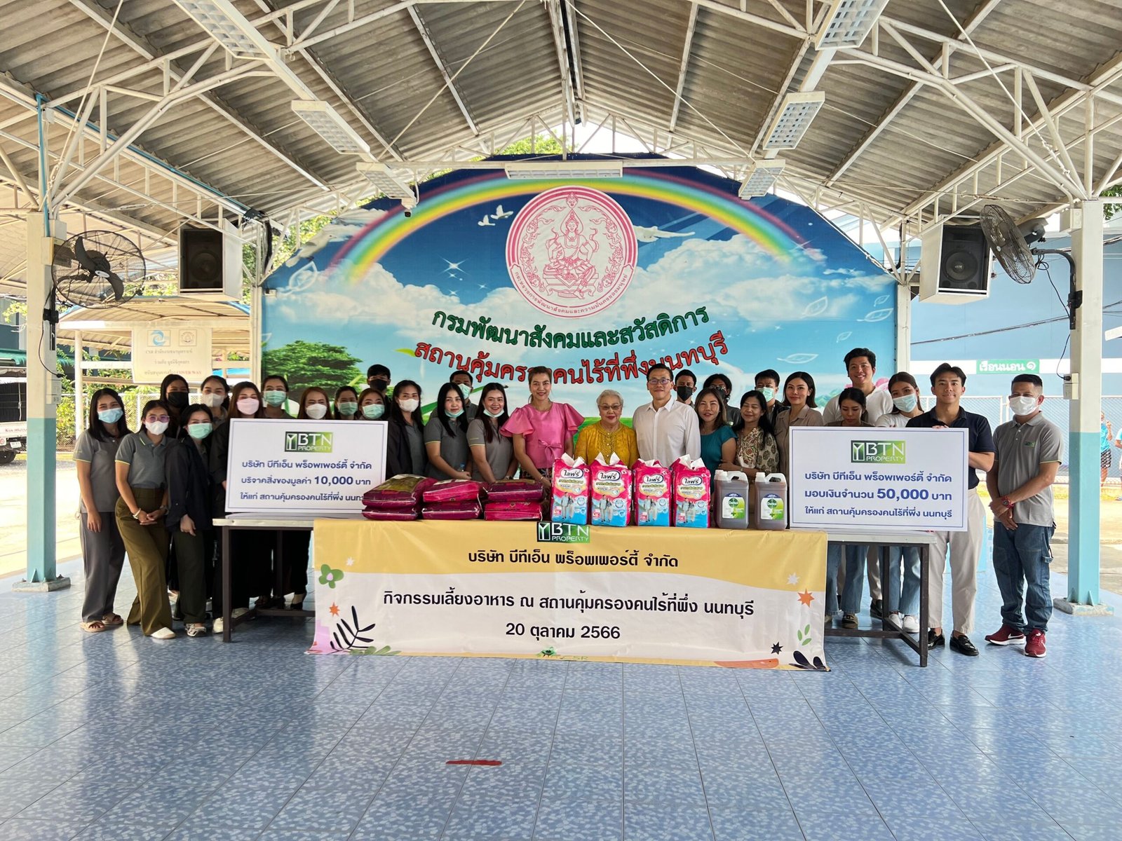 วันที่ 20 ตุลาคม 2566 บริษัท บีทีเอ็น พร็อพเพอร์ตี้ จำกัด พร้อมตัวแทนพนักงานได้มีการจัดกิจกรรมเลี้ยงอาหารและซื้อของใช้จำเป็น พร้อมทั้งมอบเงินจำนวน 50,000 บาทที่สถานคุ้มครองคนไร้ที่พึ่ง นนทบุรี