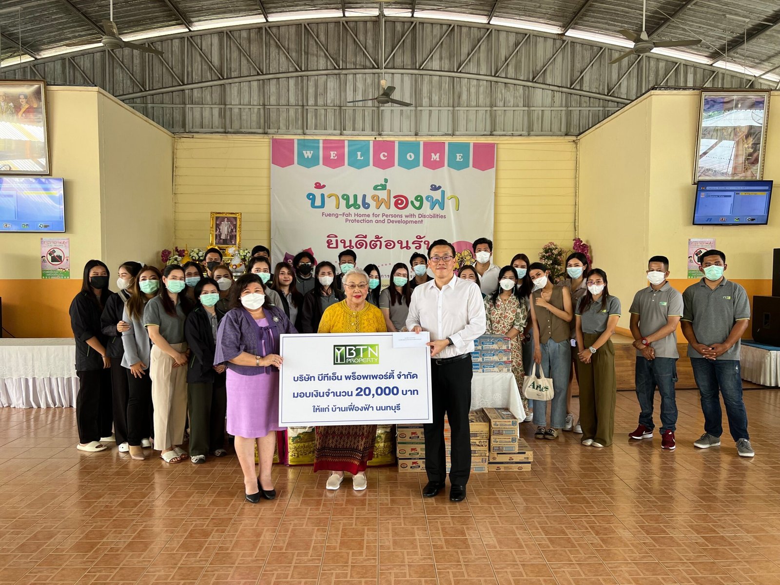วันที่ 20 ตุลาคม 2566 บริษัท บีทีเอ็น พร็อพเพอร์ตี้ จำกัด พร้อมตัวแทนพนักงานได้มีการจัดกิจกรรมเลี้ยงอาหารและซื้อของใช้จำเป็น พร้อมทั้งมอบเงินจำนวน 20,000 บาทให้กับบ้านเฟื่องฟ้า นนทบุรี